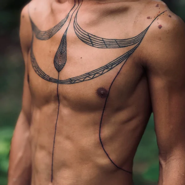 A mellkason található komplikált tetoválások (dudukat) és a könyökön gyöngyök (ngalou) közel hozzák a tetoválásokat a lélekhez.