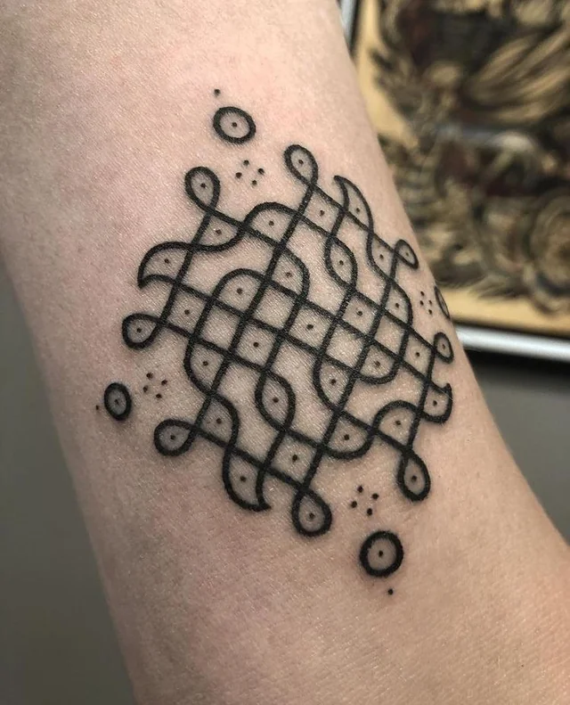 Nem meglepő módon a 20. század elején Kelet-India részén viselt tetoválások a kolam rajzokból származtak, mivel ezekről azt hitték, hogy védő tulajdonságaik vannak. Ezek az összetett és nehéz tetoválások olyanok voltak, mint valami kirakósok. A lényeg az volt, hogy Yama (a halál istene) és az ő démonai nem bánthatták a tetoválás viselőjét, mivel képtelenek voltak a puzzle megfejtésére. A démonokat labirintusba csalták, ahol elvesztődték, majd elvesztették erejüket is. Ugyanakkor a kolam rajzok a túlvilági élettel is kapcsolatban álltak. Néhány törzs körében elterjedt az a hiedelem, hogy a nők és férfiak tetoválást kell viseljenek, azért, hogy majd a túlvilágon a démonok és a halál istene ne bánthassa őket. Ezek a tetoválások olyanok voltak, mint a térképek: úgy gondolták, hogy elvezetik a viselőjét a túlvilágba, ahol újra találkozhat elhunyt hozzátartozóival.